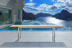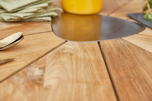 | Design-Highlight Die extra breiten Lamellen aus recyceltem Teakholz verleihen dem Tisch eine exklusive und edle Optik. Durch das moderne Design ist dieser Tisch absolut zeitlos. | |