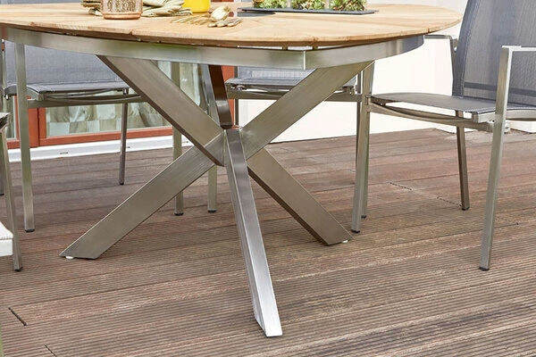 | Hochwertige Materialien Das Gestell des Tisches ist aus rostfreiem Edelstahl gefertigt und kann daher bei Wind und Wetter in Ihrem Garten stehen bleiben. Teakholz benötigt keine Pflege oder Behandlung und ist dank seines hohen Anteils natürlicher Öle besonders witterungsbeständig. | |
