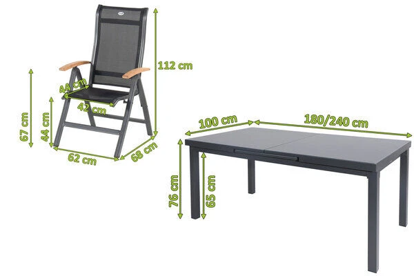Die Multipositionssessel bestechen durch ihre schlichte Optik mit dem pulverbeschichteten Aluminiumrahmen in einem modernen Anthrazit in Kombination mit dem schwarzen Textilen-Gewebe. Ergänzt wird dieses zeitlose Design durch FSC-zertifizierte Teakholz-Armlehnen. Auch funktional überzeugen die bequemen Gartensessel: Die Rückenlehne lässt sich kinderleicht mehrfach verstellen und bietet damit einen hervorragenden Sitzkomfort. Dank des pulverbeschichteten Aluminiumgestells sind die Sessel zudem leicht und einfach zu transportieren. Je nach Bedarf können die Hochlehner schnell und einfach zusammengeklappt und platzsparend verstaut werden.