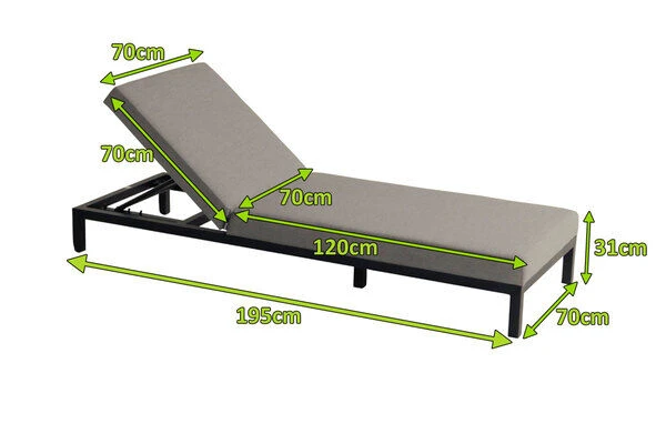 Auf dieser Liege können Sie mit einem gemütlichen Buch in der Sonne liegen und nach einem langen Arbeitstag entspannen. Hierzu brauchen Sie einfach nur Platz zu nehmen und sich mithilfe der Rasterschiene problemlos eine bequeme Liege- oder Sitzposition einstellen. Die Liege hat ein Gesamtmaß von ca. 195 x 70 cm, die Sitzhöhe beträgt ca. 31 cm inkl. Kissen – so kommt die Entspannung beim Hinlegen von ganz allein. Sie überzeugt durch das Gestell aus pulverbeschichtetem Aluminium in Schwarz in Verbindung mit Sunbrella in der Farbe Flanelle. Das Zusammenspiel der verwendeten Materialien gibt der Liege ihr einzigartiges und hochwertiges Aussehen. Dank der robusten Materialien kann sie problemlos das ganze Jahr über im Freien stehen bleiben. Das Gestell aus robustem Aluminium sorgt für ein geringes Eigengewicht von nur ca. 16,8 kg, sodass sich die Liege kinderleicht verschieben oder an die gewünschte Position tragen lässt. So können Sie jederzeit flexibel entscheiden, ob Sie lieber in der Sonne oder im Schatten entspannen wollen.