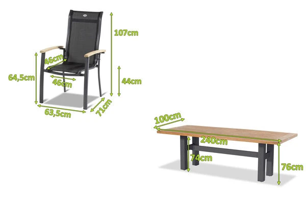 Der Tisch besteht aus einem hochwertigen Aluminiumgestell in der Farbe „Xerix“ (Anthrazit) und einer ca. 4 cm dicken Teakholz-Tischplatte in einem natürlichen Teak-Farbton. Damit hebt sich dieses Modell von den üblichen Tischen aus der Yasmani-Serie ab, denn diese gibt es normalerweise nur mit einer Tischplatte in der Farbe „Vintage Brown“, also mit einer deutlich dunkleren Tischplatte. Das bei diesem Tisch verwendete Teakholz wurde allerdings so behandelt, dass es zu 100% dem FSC-Teakholz Farbton entspricht und damit perfekt zu den im Set inbegriffenen Sesseln aus der „Alice“-Serie passt. Mit seiner Größe von ca. 240 x 100 x 77 cm bietet er dabei ausreichend Platz für 8 Personen.