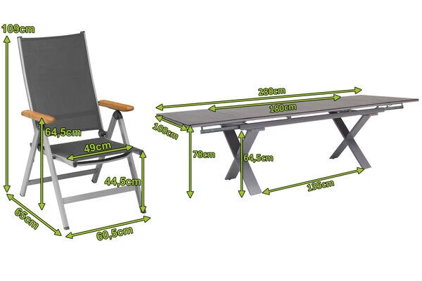 KETTLER Granada Esstischgarnitur aus Aluminium/Textilene, Silber, OUTFLEXX Ausziehtisch 180/280x100x78cm mit HPL und 6 Multipositionssessel mit Armlehnen aus FSC®-Teakholz