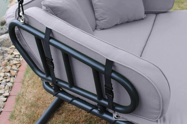 Die Liege selbst ist mit grauem Polyestergewebe bezogen. Dank seiner Licht- und Wetterbeständigkeit ist Polyestergewebe hervorragend für Outdoormöbel geeignet. Zudem bleibt es bei Feuchtigkeit formbeständig, ist strapazierfähig und pflegeleicht. Die Liegefläche der Schaukel stellt mit ca. 175 cm Breite und ca. 160 cm Tiefe eine gemütliche Erholungsfläche für Sie bereit. Die im Lieferumfang enthaltenen, ca. 6 cm dicken, lichtgrauen Kissen sind aus 100% Spun-Polyester und steigern nochmals Ihren Komfort. Die Liege hängt frei schwingend und sicher an 4 Seilen zwischen dem Stahlgestell. Zusätzlich ist die Liege mit einer Sicherung am unteren Teil des Gestells festzusetzen, was übermäßiges Schwingen verhindert.