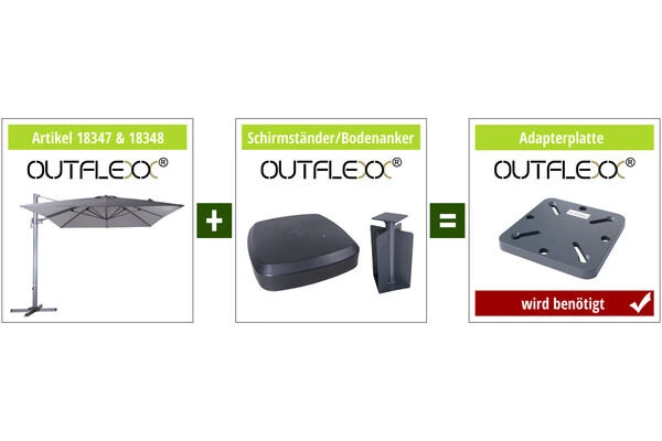 Wichtige Information: Dieser Schirm kann ohne Adapterplatte mit unseren OUTFLEXX® Schirmständern oder dem OUTFLEXX® Bodenanker kombiniert werden.
