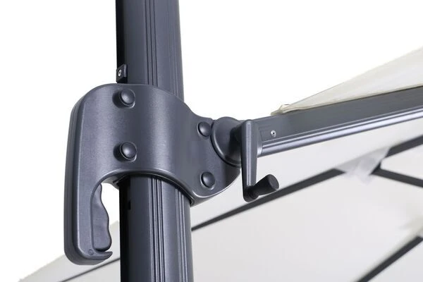 - Kurbel lässt sich in den Schirmstock umstecken, dann kann der Schirm um 360° gedreht werden.