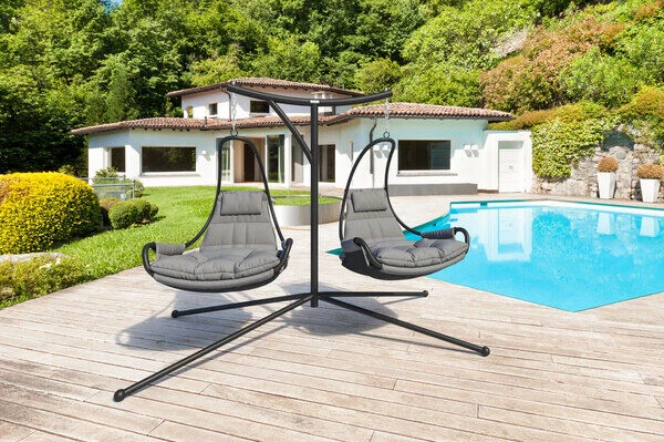 | Komfort inklusive Im Lieferumfang dieses OUTFLEXX® Doppelhängesessel sind bereits Polster und Kopfkissen in der Farbe grau enthalten. So steht dem Entspannen in Ihrem Garten nichts im Wege. | |