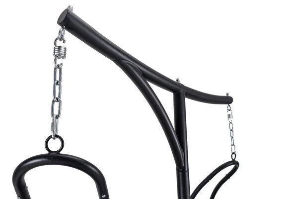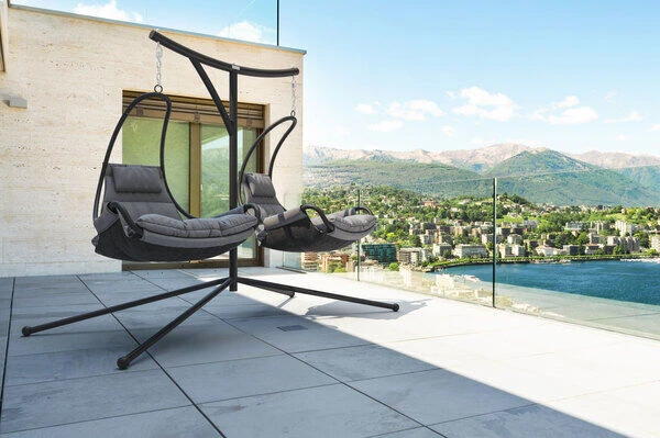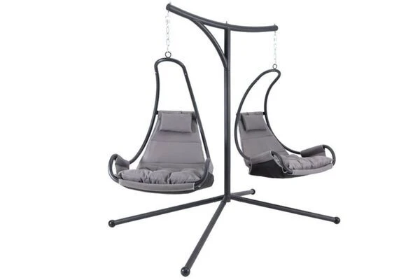 Diese Hängesessel von OUTFLEXX® haben es in sich! Die einzelnen Hängesessel werden so am Gestell befestigt, dass es Ihnen und Ihrem Gast möglich ist sich gegenseitig anzusehen. Durch die flach und weit abstehenden Elemente des Fußes hat das Gestell einen sicheren Stand und die Schwingbewegungen der Stühle machen den tragenden Elementen nichts aus. Die Sessel selbst haben keine Füße und sind mit Ketten am Gestell fixiert.