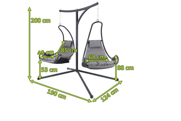 Das Gestell und die Hängesessel bestehen aus pulverbeschichtetem Stahl, welche die Farbe OUTFLEXX anthrazit matt tragen. Stahl ist ein gern verwendetes Material beim Bau von Gartenmöbeln, da es eine hohe Stabilität und Standfestigkeit aufweist. Neben seiner hohen Belastbarkeit hat Stahl nur einen sehr geringen Pflegebedarf. Die Pulverbeschichtung verbessert zusätzlich die Stoß-, Schlag- und Kratzfestigkeit des Materials und verleiht dem Stahl einen dauerhaften Korrosionsschutz und eine anhaltende Korrosionsbeständigkeit. Der Aufenthalt in Ihrem Außenbereich ist für diese besonderen Sitzgelegenheiten eine Leichtigkeit! Mit den Gesamtmaßen von ca. 190 x 124 x 200 cm und einem Gesamtgewicht von ca. 36 kg bringen die Sessel und das Gestell eine robuste Gesamtmasse mit sich. So ist eine maximale Belastbarkeit von ca. 120 kg pro Sessel möglich.