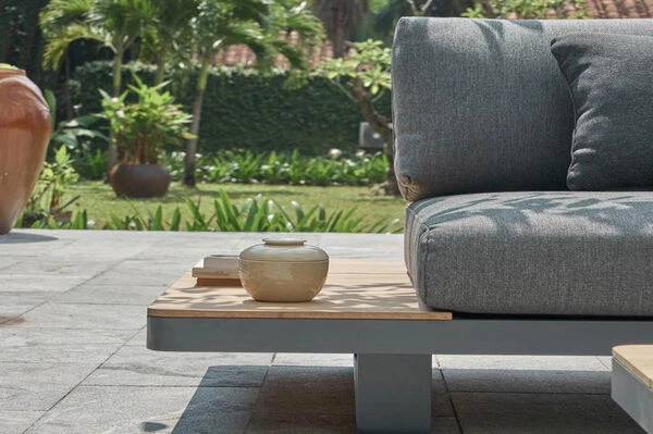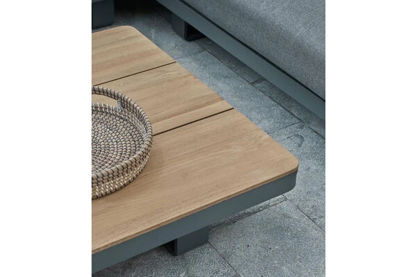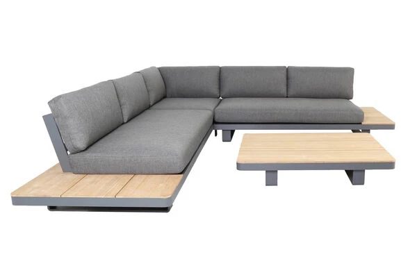 OUTFLEXX® Ecklounge aus Aluminium und Teak Holz inkl. Loungetisch sowie Polster in grau, mit Platz für 5 Personen