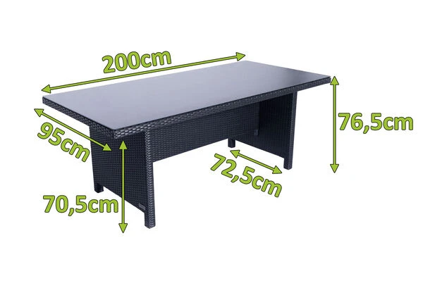 Dieser praktische Diningtisch bietet dank seiner Maße von ca. 200 x 95 x 76,5 cm großzügig Platz für sechs bis acht Personen – so steht einem gemütlichen Mittagessen mit der Familie nichts im Wege. Er wird mit einer ca. 5,5 mm starken Spraystone Platte geliefert. Spraystone ist ein Kunststoff-Stein-Gemisch, das bei diesem Artikel auf Sicherheitsglas aufgesprüht und anschließend eingebrannt wird. Daraus ergibt sich eine wetter- und kratzfeste sowie pflegeleichte Oberfläche in einer eleganten Natursteinoptik, die sich mit einem milden Reiniger und einem Lappen kinderleicht pflegen lässt. Die Unterschubhöhe des Tisches beträgt ca. 70,5 cm.