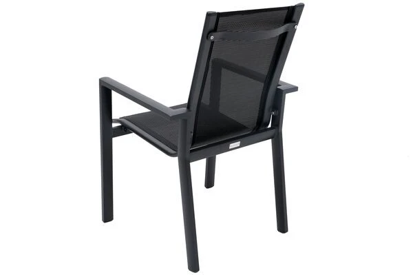 Freuen Sie sich darauf nach einem leckeren gemeinsamen Essen oder bei einem Spieleabend den Alltag in weite Ferne rücken zu lassen. Das Set besteht aus einem Esstisch und 4 dazu perfekt abgestimmten Stapelsesseln. Diese sind luftig leicht und doch stabil. Für das solide Gestell kommt korrosionsbeständiges Aluminium zum Einsatz. Die designstarken Armlehnen sorgen für zusätzlichen Komfort. Bespannt werden die durchgehenden Rücken- und Sitzflächen mit Textilene im passenden Schwarzton. Das Material ist unglaublich hautsympathisch und sorgt für ein herrliches Sitzgefühl, das Sie auch in der Sommerhitze nicht im Stich lässt. Die Gesamtmaße liegen jeweils bei ca. 60 x 69 x 93,5 cm. Mit einer Sitzfläche von ca. 42,5 x 46,5 cm sitzen Sie stets bequem. Trotz des schlanken Designs und geringen Gewichtes von ca. 3,2 kg ist jeder Sessel mit bis zu ca. 130 kg belastbar. Sie können die Leichtgewichte problemlos überall aufstellen oder zur Aufbewahrung stapeln.