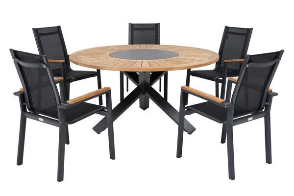 OUTFLEXX® Esstischgarnitur aus Aluminium/Textilene in schwarz, Esstisch Ø 150×75,5cm und 5 Sessel mit recyceltem FSC®-Teakholz