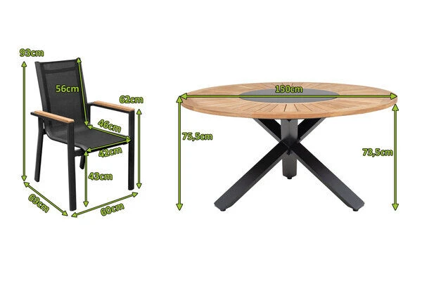 Das Set besteht aus einem Esstisch und 5 passenden Stapelsesseln. Die stylischen Sessel laden jederzeit zum Verweilen ein und sind die perfekten Begleiter in Ihrem Garten. Für das schicke Gestell kommt korrosionsbeständiges Aluminium zum Einsatz. Bespannt wird das solide Gestell mit Textilene im passenden Schwarzton. Es ist unglaublich hautsympathisch und sorgt für ein herrliches Sitzgefühl, das Sie auch in der Sommerhitze nicht im Stich lässt. Die Gesamtmaße der Sessel liegen jeweils bei ca. 69 x 60 x 93 cm. Mit einer Sitzbreite von ca. 42 cm und einer Sitztiefe von ca. 46 cm sitzen Sie stets komfortabel. Die schicken Armlehnen aus gebürstetem, natürlichen Teakholz sorgen für zusätzlichen Komfort. Trotz des schlanken Designs und geringen Gewichtes von ca. 3,9 kg ist jeder Sessel mit bis zu ca. 120 kg belastbar. Sie können sie daher problemlos überall aufstellen oder zur Aufbewahrung einfach in Ihrer Garage oder Ihrem Gartenhäuschen platzsparend stapeln.