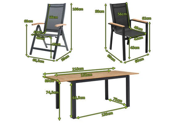 Die Gestelle sind solide gearbeitet und bestehen aus korrosionsbeständigem Aluminium im schicken “anthrazit matt”. Die ca. 2 cm dicke Tischplatte aus wiederverwertetem Teakholz macht diesen wunderschönen Tisch zum Blickfang auf Ihrer Terrasse. Die natürliche Wärme des Holzes verleiht dem Esstisch einen ganz besonderen Charme, der von der allmählichen Patinabildung in einem schönen Silbergrau noch unterstrichen wird. Wenn Sie diesem Prozess jedoch entgegen wirken möchten empfehlen wir Ihnen eines unserer Pflegeöle, welches Sie im Zubehör finden. Mit einem Gewicht von ca. 28,25 kg und bei Gesamtmaßen von ca. 152/210 x 89 x 74,5 cm ist der Tisch auch äußerst stabil. Für die nötige Leichtigkeit sorgt die Bespannung der Rücken- und Sitzflächen. Diese besteht aus dem innovativen Outdoorgewebe Textilene im trendigen Schwarzton. Das Material ist sehr hautsympathisch und sorgt für ein herrlich luftiges Sitzgefühl, das Sie vor allem in der Sommerhitze schätzen werden. Hautschmeichelnde Armlehnen – aus gebürstetem, natürlichen Teakholz – schenken den Sesseln erhöhten Komfort. Die Gesamtmaße der Stapelsessel liegen jeweils bei ca. 69 x 60 x 93 cm und haben ein Gewicht von ca. 3,9 kg. Die Multipositionssessel wiegen jeweils ca. 5,05 kg mit Maßen von ca. 68,5 x 59 x 106 cm. Alle Sessel sind dank der hohen Qualität und erstklassigen Verarbeitung bis ca. 120 kg belastbar. Natürlich können Sie die Sitzmöbel auch kinderleicht stapeln oder zusammenklappen und bis zum nächsten Einsatz verstauen.