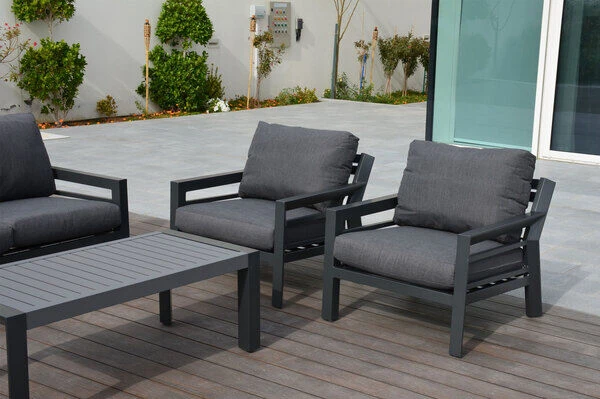 Die Loungegruppe besteht aus zwei Sesseln (ca. 80 x 86 x 72 cm), einem 2-Sitzer Loungesofa (ca. 150 x 86 x 72 cm) und einem Kaffeetisch (ca. 120 x 60 x 41 cm). Das Gestell der Loungemöbel besteht aus pulverbeschichtetem Aluminium. Aluminium ist ein sehr leichtes Metall, so dass Ihre Loungegarnitur stabil aber beweglich bleibt. Darüber hinaus besitzt Aluminium eine gute Korrosionsbeständigkeit, was zu einer langen Lebensdauer Ihrer Gartenmöbel führt. Loungegarnituren aus Aluminium können Sie unbesorgt das ganze Jahr über im Freien stehen lassen. Das Material ist witterungsbeständig und trotzt so gutem wie auch schlechtem Wetter. Zudem erleichtert es die Pflege Ihrer Gartenmöbel, da sich Verunreinigungen durch den Einsatz von Wasser schnell und unkompliziert entfernen lassen. Die Loungegruppe bietet genügend Platz für vier Personen – so findet jedes Familienmitglied seinen Lieblingsplatz. Die Polster sind aus dem Material Olefin in der Farbe grau gehalten. Die synthetische Faser Olefin (100% Polyester) wird für ihre Hitzebeständigkeit und optimalen Trage- und Pflegeeigenschaften geschätzt. Der passende moderne Loungetisch darf natürlich auch nicht fehlen. Mit seiner Größe bietet er genügend Platz, um entspannt im Kreis der Familie oder mit Freunden ein kühlendes oder auch wärmendes Getränk im Garten zu genießen.
