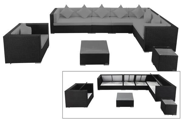 Mit acht Sitzplätzen ist diese Loungegarnitur ein wahres Prachtexemplar und bietet besonders hohen Sitzkomfort dank seiner ca. 10 cm dicken Polstern, welche mit wasserabweisenden Bezügen aus 100% Polyester (300g/m²) geschützt sind. Die verwendete flache und schwarze Polyrattanfaser ist pflegeleicht und sehr wetterfest. Sie trotzt extremen Temperaturen zwischen -60°C bis +70°C genauso wie Chlor, Salzwasser und UV-Strahlen. Im Inneren befindet sich ein rostfreies Aluminiumgestell, welches für die nötige Stabilität sorgt und aufgrund des geringen Gewichts einen einfachen Platzwechsel ermöglicht. So erweist sich diese wertbeständige Polyrattan Gartenlounge als langlebiger Begleiter.