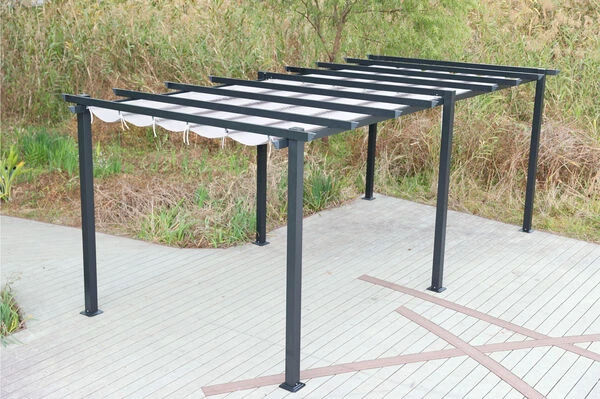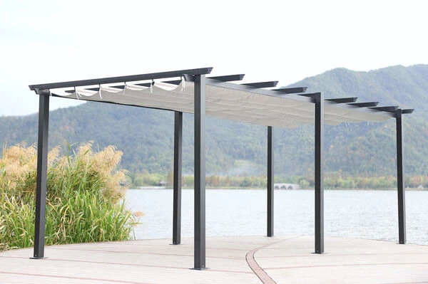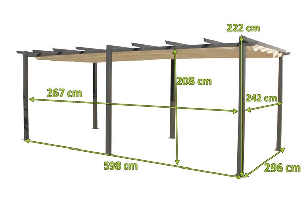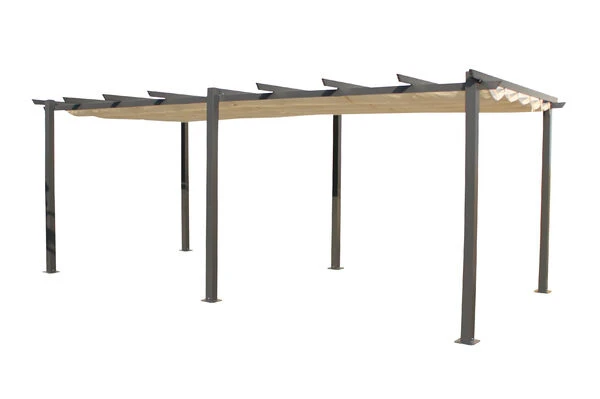 Durch einfaches Schieben kann die Bespannung am Dach geöffnet oder geschlossen werden, so dass je nach Bedarf über Schatten- und Sonnenplätze entschieden werden kann. Das Gestell aus pulverbeschichtetem Aluminium in anthrazit ist sehr robust. Die ca. 3×6 Meter große, wasserabweisend imprägnierte Bespannung ist aus 100% Polyester gefertigt und in einem modernen Cremeton gehalten. Die Bespannung ist aus 100% Polyester gefertigt und wird durch Dachstreben aus pulverbeschichtetem Aluminium gehalten. Das Polyester ist PA-beschichtet und hält daher kurzen Regenschauern stand und verfügt über optimalen Sonnenschutz mit einem Sonnenschutzfaktor von UV30+. Dank der hochwertigen Materialien und deren Verarbeitung ist diese Pergola besonders witterungsbeständig und robust. Das Gewicht von ca. 51 kg macht die Pergola besonders stabil.