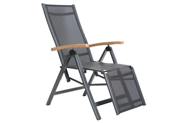 Relaxsessel von OUTFLEXX® aus Aluminium/Textilene in OUTFLEXX® anthrazit matt/schwarz mit FSC®-zertifizierten Teakholz-Armlehnen
