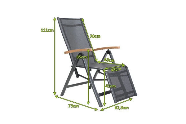 Das Gestell besteht aus korrosionsbeständigem Aluminium im schicken OUTFLEXX® anthrazit matt, während die hautschmeichelnden Armlehnen – aus gebürstetem, natürlichen Teakholz – erhöhten Komfort schenken. Bespannt wird das solide Gestell mit Textilene im passenden Schwarzton. Es ist unglaublich hautsympathisch und sorgt für ein herrlich luftiges Sitzgefühl, das Sie auch in der Sommerhitze nicht im Stich lässt. Die Gesamtmaße des Sessels liegen bei ca. 73 x 61,5 x 111 cm. Mit einer Sitzbreite von ca. 48 cm und einer Sitztiefe von ca. 48 cm sitzen Sie stets komfortabel. Dank der hochwertigen Materialien und erstklassigen Verarbeitung ist der ca. 6,3 kg leichte Sessel bis zu ca. 120 kg belastbar. Sie können den Sessel somit auch ganz nach Bedarf an Ihren Lieblingsplätzen aufstellen, ihn nach der Sonne ausrichten oder auch, wenn nötig, schnell unters Dach oder in den Schatten bringen. Die Klappfunktion macht es einfach den Sessel bis zu seinem nächsten Einsatz zu verstauen.