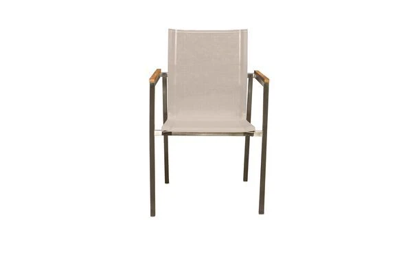 Die zeitlosen Stapelstühle besitzen eine Bespannung aus hochwertigem Textilen in der Farbe taupe, hergestellt aus 70% Polyvinylchlorid und 30% Polyester. Das witterungsbeständige Material ist durch seine Flexibilität auch ohne Auflagen sehr bequem. Das formstabile Gewebe nimmt kein Wasser auf, ist atmungsaktiv und trocknet nach einem kurzen Schauer sehr schnell. Das sorgfältig verarbeitete Gestell aus rostfreiem 304er Edelstahl ist ebenfalls besonders witterungsbeständig und hält wie die anderen Materialien dieser Stühle sowohl Frost und Hitze, als auch Feuchtigkeit und Regen aus. Die hochwertigen Materialien und die sorgfältige Verarbeitung sorgen nicht nur für die besondere Optik dieser Stühle, sondern machen sie mit einer Belastbarkeit von ca. 150 kg sehr stabil. Dank der schwarzen Kunststoffkappen an den Stuhlbeinen ist Ihr Boden geschützt. Bei Bedarf können Sie die Stühle einfach stapeln und platzsparend verstauen.