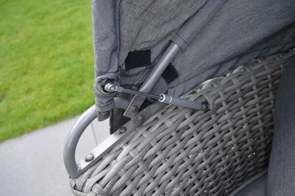 An sonnigen Tagen verwenden Sie einfach das Sonnenschutzdach, das dank Springmechanismus schnell aufzustellen und mit Knebelhaken am Grundgestell zu fixieren ist – so spendet es Ihnen angenehmen Schatten und schützt außerdem vor Wind oder unerwünschten Blicken. Da nicht immer die Sonne scheint, sorgt die Wetterbeständigkeit und Pflegeleichtigkeit des Materials für den nötigen Schutz. Die synthetische Faser Olefin wird für ihre Hitzebeständigkeit und optimalen Trage- und Pflegeeigenschaften geschätzt. Polyrattan ist ebenfalls eine wetterfeste Faser, die besonders widerstandsfähig gegen Umwelteinflüsse ist und wird perfekt durch das Gestell aus pulverbeschichtetem Aluminium ergänzt.