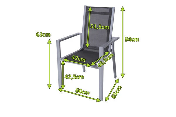 Leicht und gleichzeitig unheimlich stark: das sind die modernen Stapelsessel von OUTFLEXX®. Für das schicke und solide Gestell kommt korrosionsbeständiges Aluminium mit Pulverbeschichtung im glanzvollen Silberton zum Einsatz. Bespannt wird das Gestell mit Textilene im passenden Grauton und es sorgt für ein herrlich luftiges Sitzgefühl, das seinesgleichen sucht. Die durchgehende Sitz- und Rückenfläche ist darüber hinaus unglaublich hautsympathisch und verliert nie ihre Form. Die Gesamtmaße des Sessels liegen bei ca. 65 x 60 x 94 cm. Mit einer Sitzbreite von ca. 42 cm und einer Sitztiefe von ca. 46,5 cm sitzen Sie stets komfortabel. Bei einer Sitzhöhe von ca. 42,5 cm passt der Sessel auch unter eine Vielzahl von Tischen und bietet Ihnen genügend Beinfreiheit. Erhöhten Komfort schenken Ihnen die schlichten und zugleich markanten Armlehnen aus Aluminium, die auch optisch zu überzeugen wissen. Dank der hochwertigen Materialien und erstklassigen Verarbeitung ist der ca. 3,3 kg leichte Sessel bis zu ca. 120 kg belastbar. Sie können das Federgewicht somit auch ganz nach Bedarf an Ihren Lieblingsplätzen aufstellen oder bei Bedarf in den Schatten bringen. Zur Aufbewahrung stapeln Sie den Sessel einfach platzsparend in der Garage oder im Gartenhäuschen bis zu seinem nächsten Einsatz.