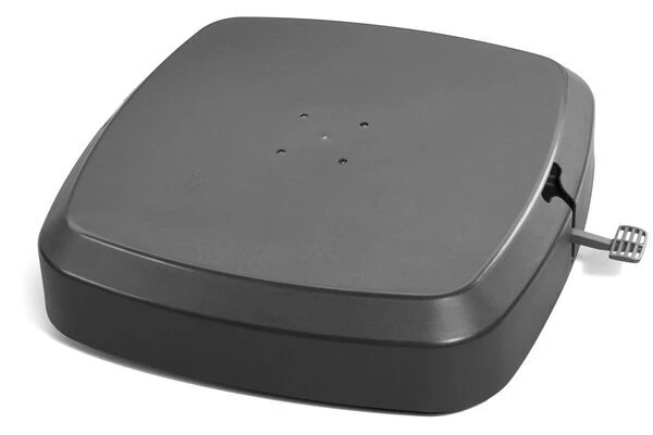 Dieser Kunststoff-Schirmständer mit einem stabilen Fahrgestell aus pulverbeschichtetem Stahl besitzt vier Kunststofftanks, welche mit Sand oder Wasser bis zu einem Gewicht von ca. 110 kg mit Sand bzw. bis ca. 90kg mit Wasser befüllt werden können. Das Eigengewicht des Schirmständers beträgt ca. 34 kg.