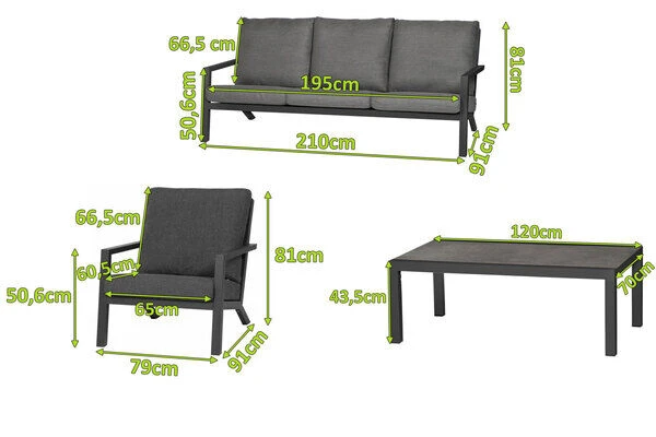 Das Loungesofa hat ein Gesamtmaß von ca. 210 x 91 x 81 cm und bietet mit einer Sitztiefe von ca. 60,5 cm und einer Sitzbreite von ca. 195 cm eine großzügige Sitzfläche mit genügend Platz für 3 Personen. Bei einer Sitzhöhe von ca. 30 cm lässt es sich herrlich entspannen, ob allein bei einem Nickerchen oder gemeinsam mit Ihren Liebsten. Die Loungesessel runden das Set perfekt ab, sie sind ca. 79 x 91 x 81 cm groß und laden jederzeit zum Verweilen ein. Die praktischen ca. 50,6 cm hohen Armlehnen aus Aluminium bieten zusätzlichen Komfort. Der Loungetisch hat eine Größe von ca. 120 x 70 cm und eine Gesamthöhe von ca. 43,5 cm. Er wird mit einer modernen Keramik-Tischplatte in anthrazit geliefert, die dem Tisch seinen edlen Charakter und natürlichen Look verleiht. Die Platte ist robust, pflegeleicht und dazu noch wetterfest – ideal für die Nutzung im Außen- und Innenbereich. An diesem Tisch kommt man gerne zusammen!
