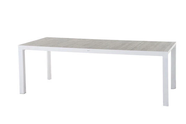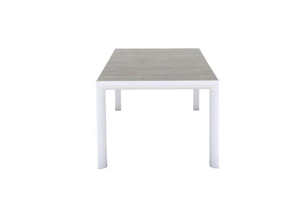 Wer das Besondere liebt ist mit diesem Esstisch bestens bedient. Der Tisch bietet mit seinen Maßen von ca. 220 x 100 x 74 cm Platz für ca. 8 Personen – so steht dem gemütlichen Mittagessen mit der Familie nichts mehr im Wege. Das Gestell wurde aus pulverbeschichtetem Aluminium in matt weiß hergestellt, was den Tisch besonders haltbar macht. Die Tischplatte besteht aus hochwertigem Keramik, während die Tischbeine für ein weiteres optisches Highlight sorgen. Durch die großzügige Unterschubhöhe kann man gemütlich mit vielen Arten von Sesseln an diesem Tisch Platz nehmen. Der Tisch ist durch das Eigengewicht perfekt gegen Windstöße geschützt. Die Fußkappen bestehen aus Kunststoff und schützen den Boden vor unschönen Kratzern beim Verrücken des Möbelstücks.