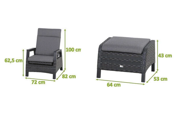 Gönnen Sie sich ein wenig Luxus in Ihrem Alltag und verbringen Sie in gepflegter Atmosphäre den Tag auf Ihrer Terrasse: bei einem leckeren Frühstück, bei einem genüsslichen Brunch oder lassen Sie bei einem Abendessen den Tag in geselliger Runde ausklingen. Das Set bestehend aus Dining Sessel und dem dazu passenden Hocker lädt Sie und Ihre Gäste jederzeit zum Zurücklehnen und Verweilen ein. Der bequeme Stoff der Rückenlehne ermöglicht ein müheloses Entspannen. Der Sessel hat ein Gesamtmaß von ca. 82 x 72 x 100 cm. Die ca. 53 cm breite Sitzfläche bietet genügend Platz. Mit einer großzügigen Sitztiefe von ca. 55 cm und bei einer Sitzhöhe von ca. 37 cm lässt es sich hier auch herrlich bei einem Nickerchen entschleunigen. Die praktischen Armlehnen in einer Höhe von ca. 63 cm bieten zusätzlichen Komfort und sind echte Hingucker. Passende Sitzpolster verleihen dem Loungesessel ein unvergleichliches Sitzerlebnis.
