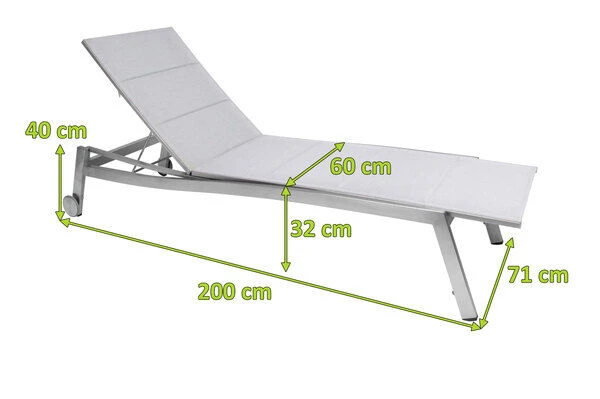 Das verstellbare Rückenteil mit einer hautfreundlichen und luftdurchlässigen Bespannung aus Textilen sorgt für ein äußerst angenehmes Liegen in verschiedenen Positionen. Mit den angebrachten Rollen ist die Liege einfach im Garten und auf der Terrasse zum jeweiligen Lieblingsplatz transportierbar. Die Rückenlehne lässt sich in 5 verschiedene Neigungen richten (5° / 20° / 30° / 40° / 50°).So finden Sie stets die passende Sitz-oder Liegeposition, um sich so richtig zu entspannen. Durch die gepolsterte Liegefläche bietet diese Liege ganz besonderen Komfort, der für optimale Erholung sorgt.